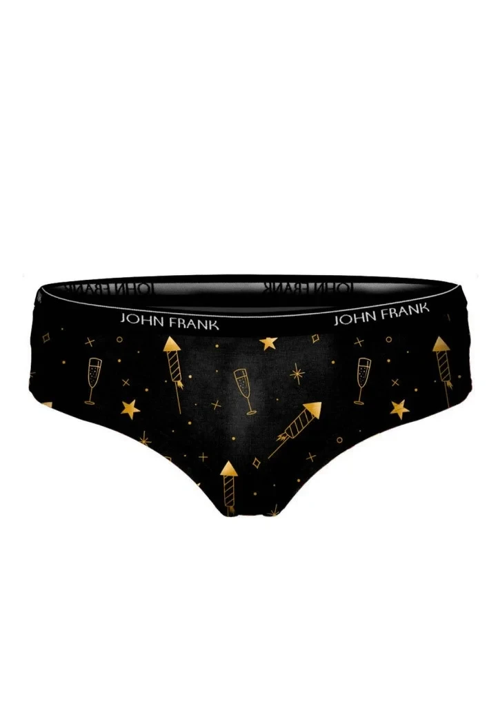 Dámské kalhotky střihu hipster od značky John Frank z vysokého podílu bavlny. Kalhotky s módně zpracovaným potiskem jsou velmi příjemné na dotek a pohodlné při nošení. Jemná, středně široká guma v pase má kolem logo John Frank. Do vnitřního dílu je zapracován bavlněný klínek pro komfortní nošení.
