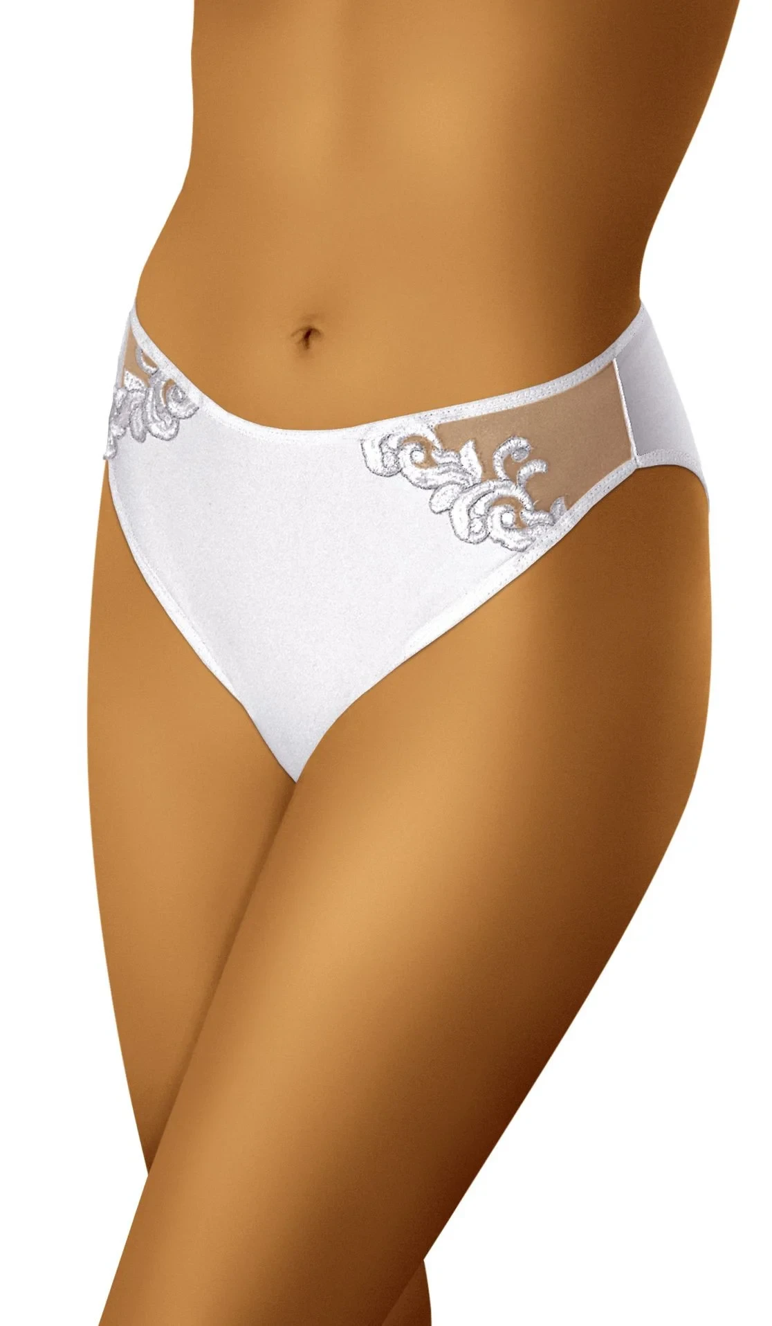 Klasické, velmi ženské kalhotky s prolamovaným zdobením na bocích boků. Vyrobené z pružného, odolného úpletu, dokonale se přizpůsobí tvaru těla. 83 % polyamid, 17 % elastan.