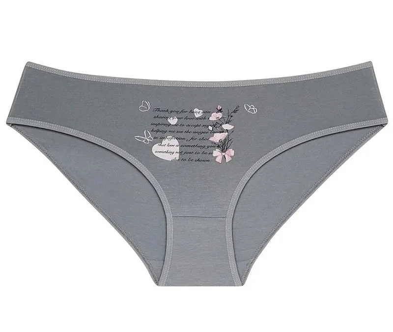 Dámské kalhotky Iva. Dámské kalhotky klasického střihu. Kalhotky jsou ozdobeny potiskem květin a drobným nápisem. Použitý materiál je příjemný a poddajný na dotek.
