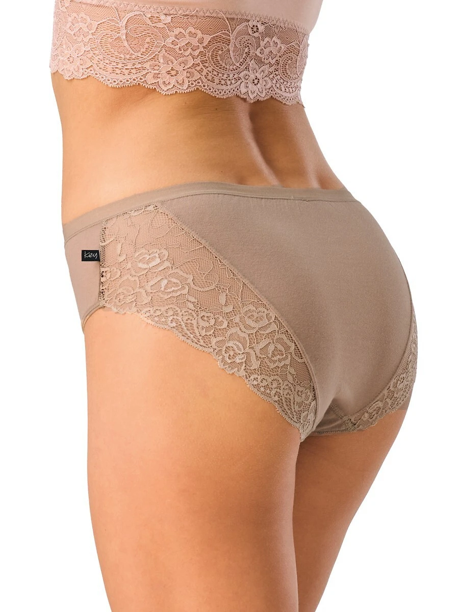 Kalhotky mají vysoký pas a na bocích jsou plnější. Zadní díl modelu zdobí ažurová krajka s květinovým motivem. Kalhotky mají v pase pohodlnou plochou gumu.