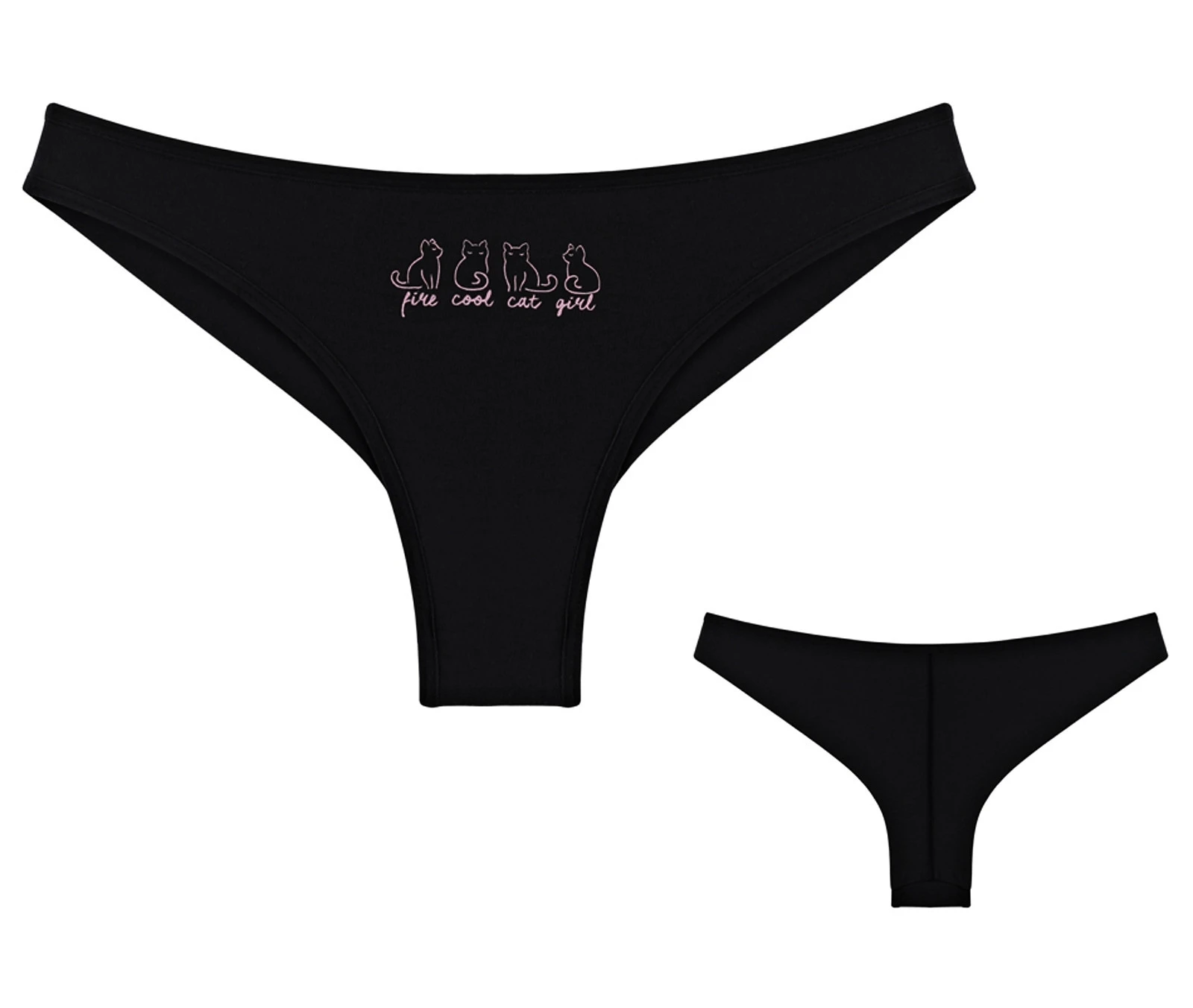 Dámské kalhotky brazilky Kočka. Slušivé brazilky jsou pohodlným typem spodního prádla pro všechny příležitosti. Zdobí je obrázek koček. Obzvláště oceníte materiálové složení - 95% bavlna a 5% elasten.