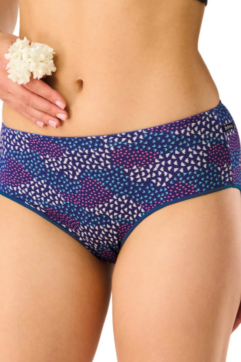 Tmavě modrý základ s drobným pestrobarevným potiskem v geometricko-rostlinném motivu dodává prádlu lehký a svěží charakter. Je ideální volbou pro ženy, které mají rády decentní, ale originální vzory ve svém každodenním šatníku.