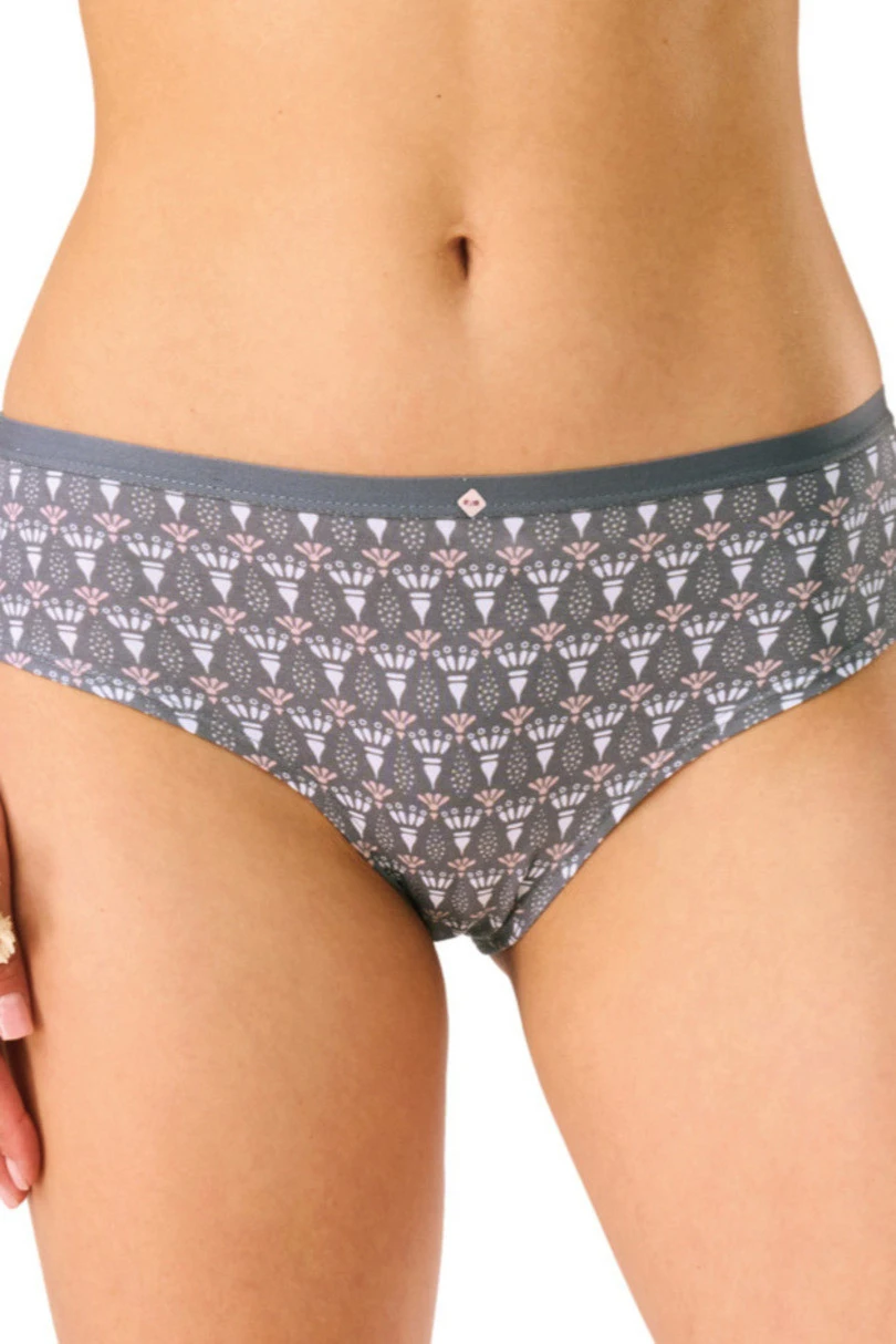 Praktická dvojkombinace dámských kalhotek KEY, vytvořená pro každodenní pohodlí a styl, obsahuje dva páry kalhotek: jedny v šedé barvě s geometrickým vzorem a druhé ve světlém odstínu s jemným potiskem.