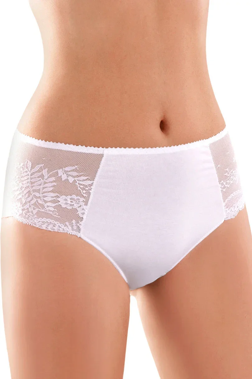Vysoké bavlněné dámské kalhotky s krajkovou vsadkou na bocích.