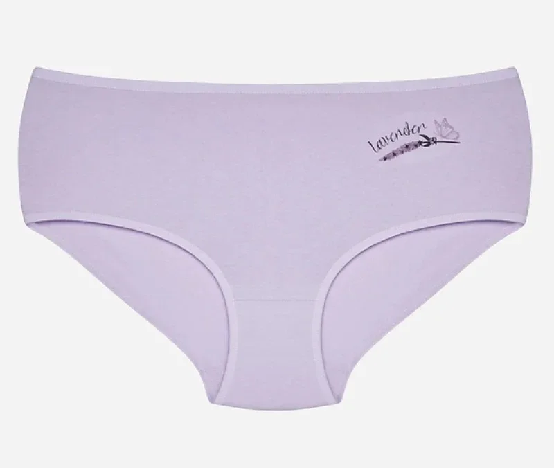 Dámské kalhotky Matylda. Dámské kalhotky klasického střihu jsou ozdobeny jemným potiskem kvítků levandule. Použitý materiál je příjemný a poddajný na dotek.