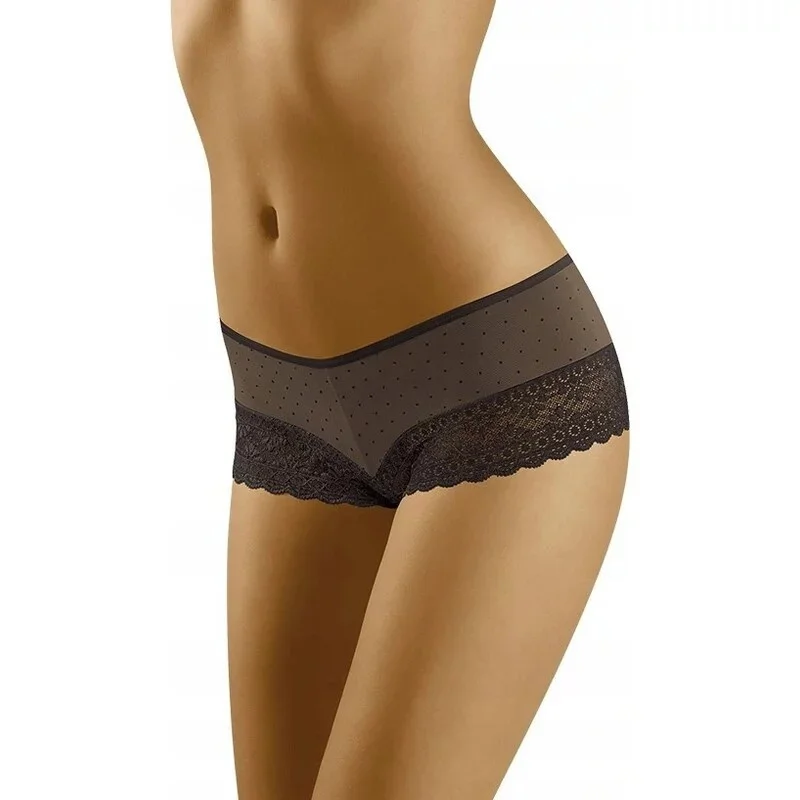 Dámské černé kalhotky v šortkovém střihu s nevykrojenou nohavičkou. Dámské kalhotky jsou vyrobeny z jemného tylu a pružné krajky. Okraje nohaviček zdobené krajkou. Bavlněný klínek. Dámské černé kalhotky v šortkovém střihu s nevykrojenou nohavičkou. Dámské kalhotky jsou vyrobeny z jemného tylu a pružné krajky. Okraje nohaviček zdobené krajkou. Bavlněný klínek. Materiál: 83% polyamid, 13% elastan