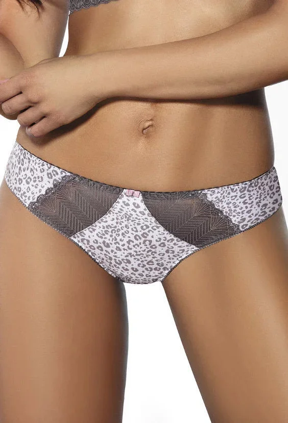 Dámské kalhotky s klasickým střihem a mírně vyššími boky.Kalhotky jsou vyrobené ze vzorovaného mikrovlákna. Přední díl modelu zdobí šedé krajkové vsadky. Zadní díl je hladký, jednobarevný.Složení: 81 % polyamid, 11 % elastan, 8 % bavlna.