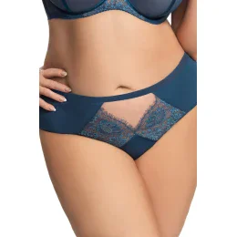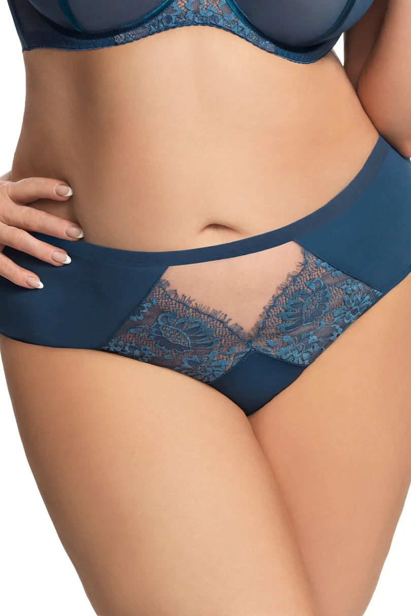 Přední díl kalhotek je ozdobený dvěma vsadkami z béžového tylu a jemné krajky. Spodní část modelu je olemovaná tenkou hladkou pružnou páskou. Zadní díl kalhotek je olemovaný dvojitě složeným pružným tylem.