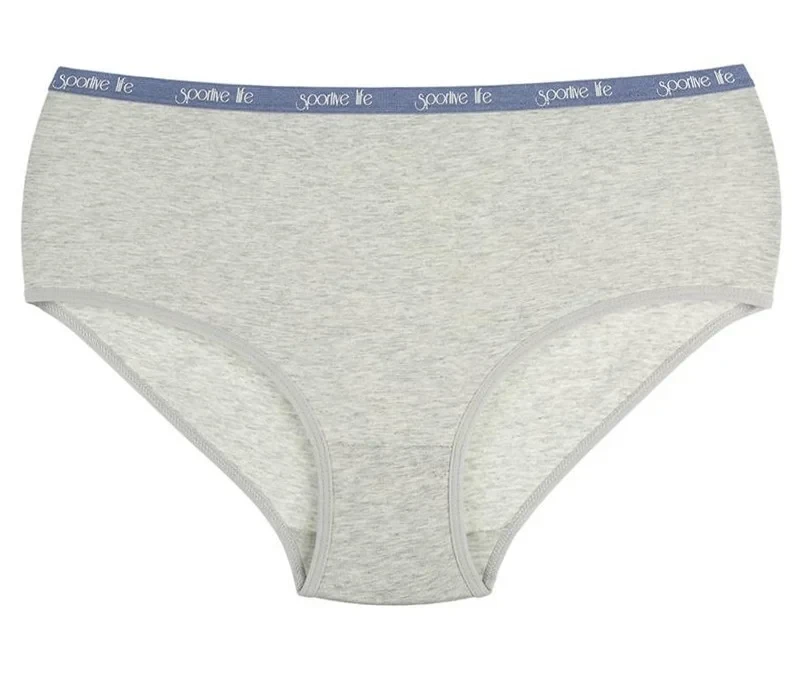 Dámské kalhotky Viola. Pohodlné dámské jednobarevné kalhotky jsou ozdobené modrou gumičkou s nápisem 'Sportive life'. Použitý materiál je jemný a poddajný na dotek.