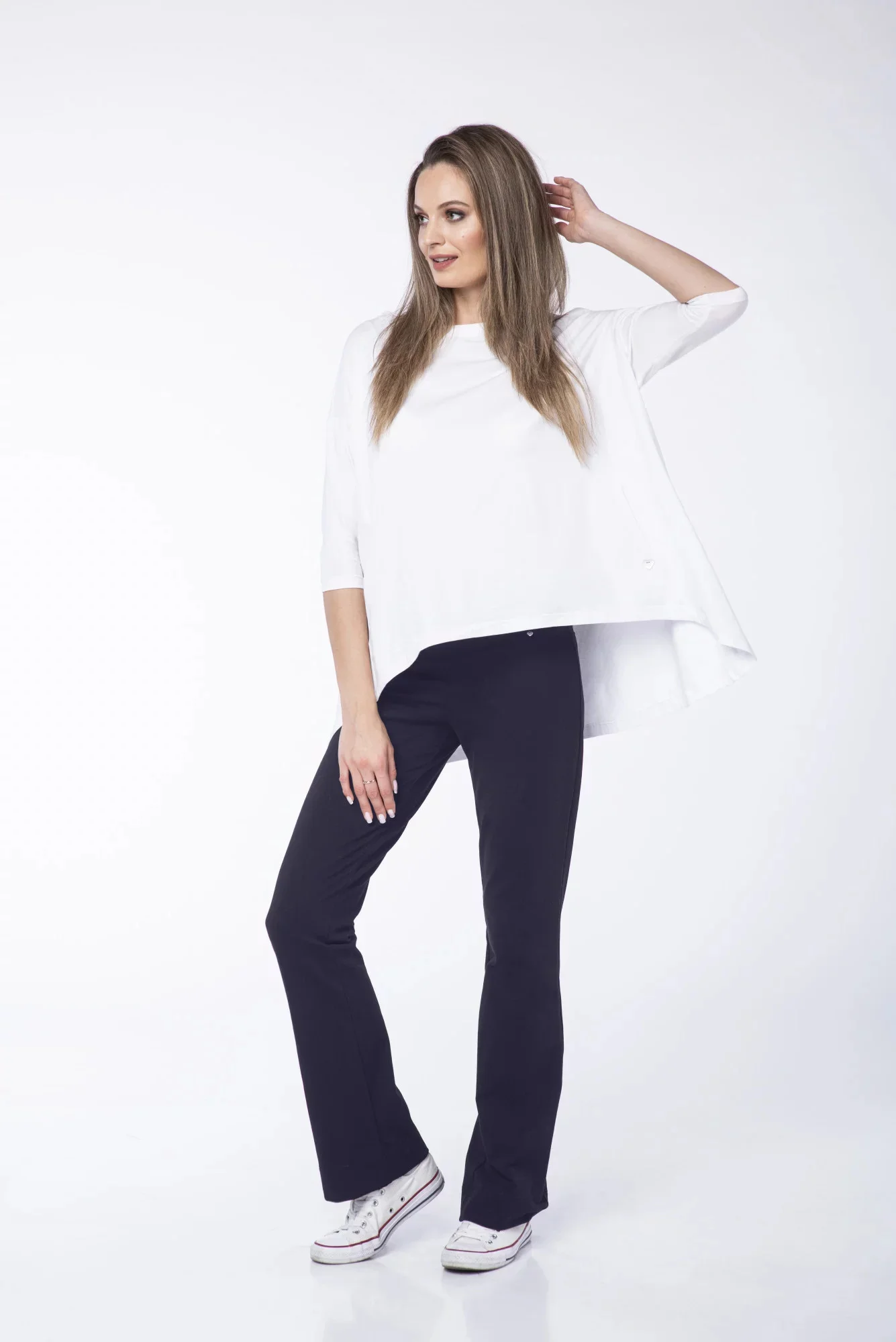Nejpohodlnější verze kalhot bootcut. Perfektně přiléhají ke spodní části těla, zeštíhlují stehna a prodlužují nohy. Můžete je obout na vysoké podpatky i tenisky a splní vám všechny sny o pohodlném LOOK. Kromě toho mají dvě úhledné kapsy na spodní straně a široký pásek v pase, takže s nimi můžete volně manipulovat a dokonale vypasují vaši postavu. To je způsobeno použitou přízí z organické bavlny a elastanu s vysokým obsahem zákrutů. Možná se ukáže, že to budou vaše oblíbené kalhoty nejen pro tuto sezónu.