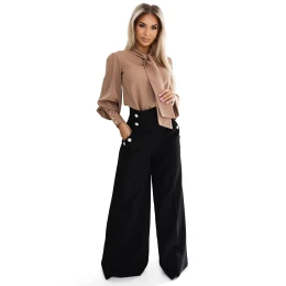 Dámské kalhoty 496-2 NUMOCO - černá barva - z hladkého černého matného materiálu - široké nohavice s vysokým pasem - zlaté knoflíky - praktické kapsy