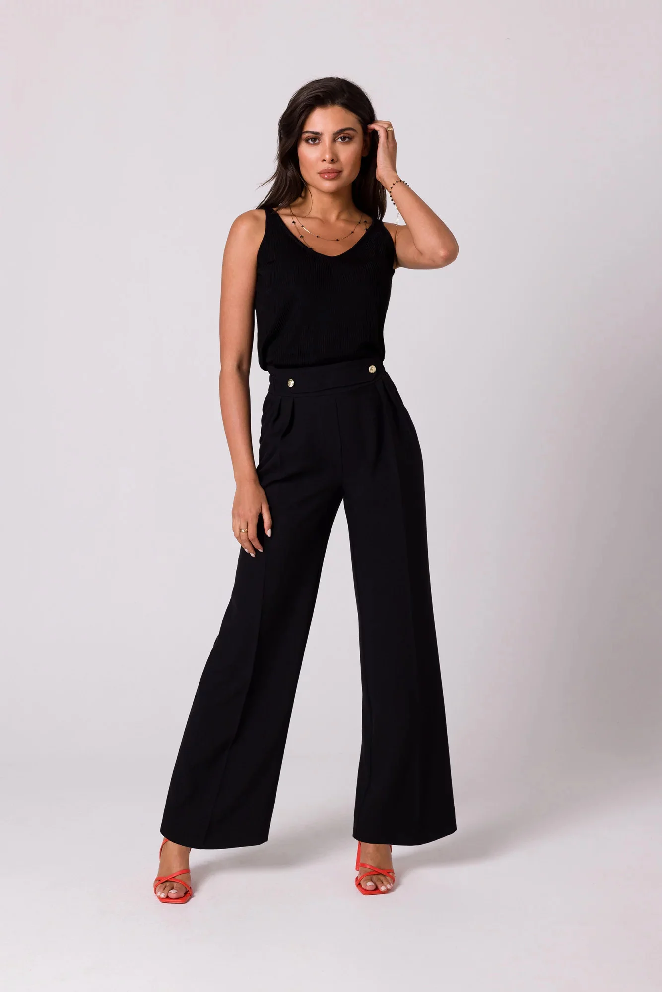 Design těchto lehkých kalhot si zamilujete - široké nohavice se záhyby, částečně elastický pas a ozdobné zlaté knoflíky vpředu.