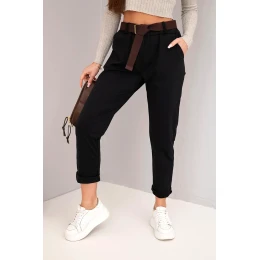 Dámské kalhoty bavlněné s páskem a ohrnutým lemem černé
