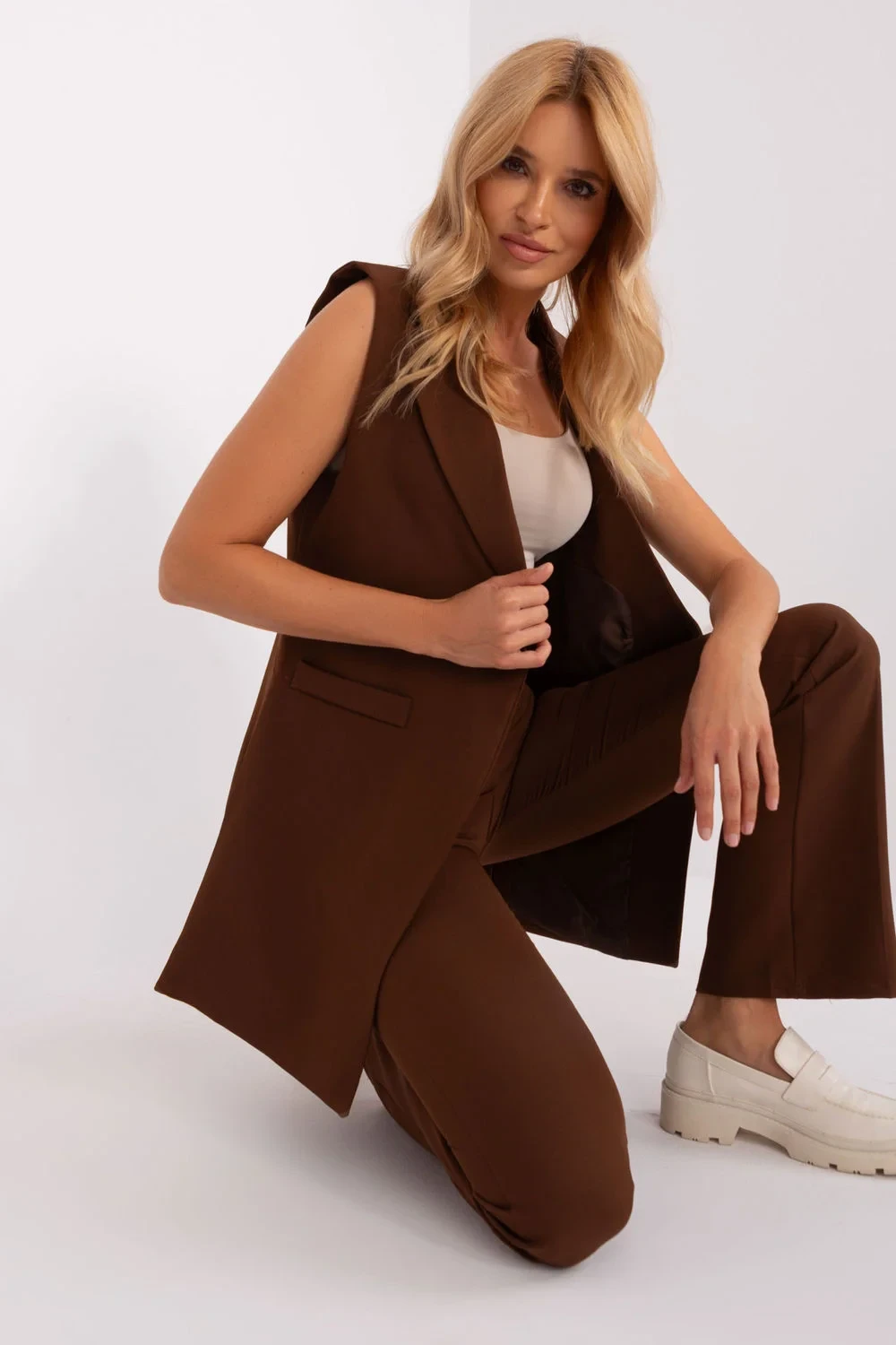 Tato souprava vesty a kalhot je ideální volbou pro různé příležitosti, od formálního po pracovní nebo každodenní styl. Je vyrobena z vysoce kvalitního polyesteru a poskytuje elegantní vzhled a odolnost. Kalhoty s širokými nohavicemi a vysokým pasem dodávají šmrnc, zatímco hladký design a absence kapes vytvářejí elegantní vzhled. Podšitá vesta je pohodlným doplňkem, který dodává celé soupravě luxusní vzhled. Oba díly soupravy jsou dlouhé, což dodává soupravě elegantní nádech. Kalhoty s vysokým pasem zvýrazňují pas a polyesterová tkanina je nejen odolná, ale také příjemná na nošení. Jedná se o ideální volbu pro slavnostní příležitosti, do práce nebo na večerní posezení.
