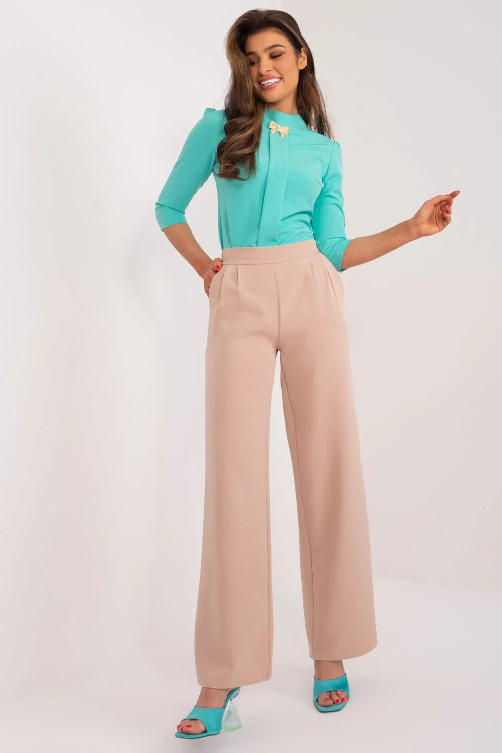 Dámské kalhoty bez knoflíků vyrobené z vysoce kvalitního polyesteru jsou elegantní a klasickou volbou, která se hodí pro různé příležitosti, zejména do práce nebo na formální schůzky. Jejich hladká tkanina jim dodává sofistikovaný nádech, takže jsou dokonalým doplňkem elegantního šatníku. Vysoký pas dodává kalhotám eleganci, zdůrazňuje pas a vytváří proporce, které jsou stylové a pohodlné zároveň. Střih nohavic je rovný, což kalhotám dodává univerzálnost a nadčasovost. Díky absenci zapínání jsou tyto kalhoty mimořádně pohodlné a zároveň vypadají elegantně a elegantně. Boční kapsy dodávají kalhotám praktičnost a umožňují uložit drobné předměty nebo mít je po ruce. Polyesterový materiál je nejen odolný, ale také se snadno udržuje. Díky němu kalhoty vypadají vždy elegantně a úhledně. Jsou vynikající volbou pro ženy, které si cení pohodlí a zároveň dbají na estetiku svého oblečení. Tyto elegantní dámské kalhoty bez knoflíků jsou vynikající volbou pro ženy, které dávají přednost klasickému a zároveň modernímu stylu. Jsou ideální pro každodenní situace v práci i formálnější události, kde jde elegance ruku v ruce s pohodlím.