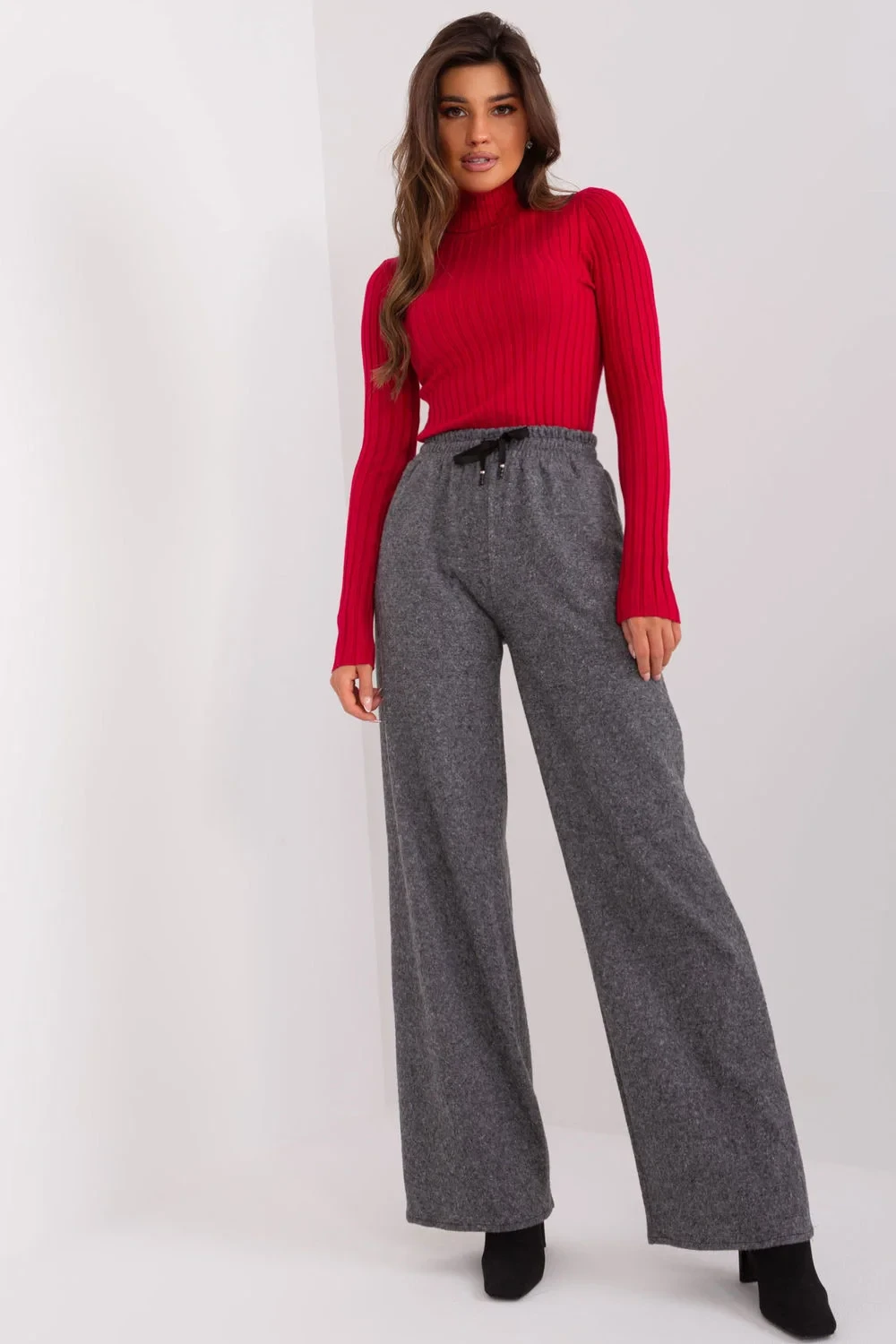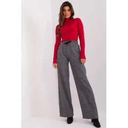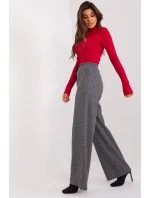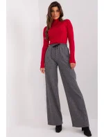 Látkové kalhoty s vysokým pasem v ležérním stylu, zavazováním v pase a nakládanými kapsami. Široké kalhoty z šedočerné látky. Varianta pro mnoho příležitostí.