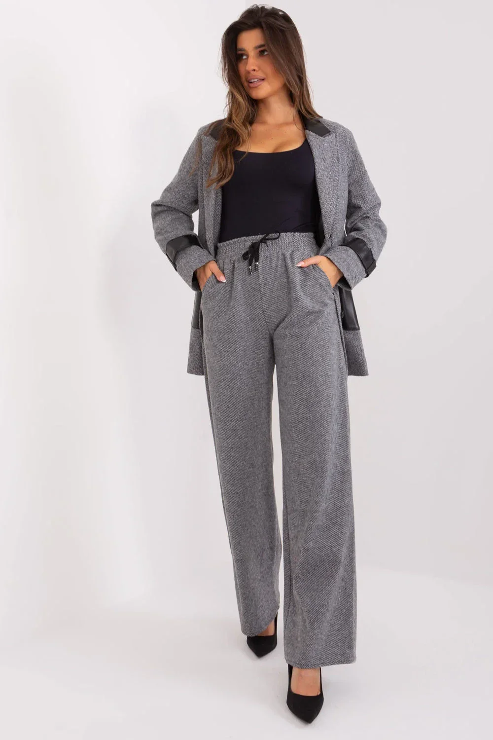 Látkové kalhoty s vysokým pasem v ležérním stylu, zavazováním v pase a nakládanými kapsami. Široké kalhoty z šedočerné látky. Varianta pro mnoho příležitostí.