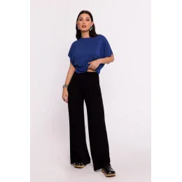 Dámské kalhoty z vysoce kvalitního viskózového úpletu, který se vyznačuje vynikajícím pocitem měkkosti a pohodlí na pokožce. Strečová tkanina zaručuje volnost pohybu, takže kalhoty jsou ideální volbou pro každou příležitost. Tento model je dokonalou kombinací elegance a pohodlí. Kalhoty mají praktický elastický pas, který zajišťuje dokonalé přizpůsobení a zároveň zvýrazňuje postavu. V přední části kalhot jsou modelující záhyby, které jim dodávají jedinečný charakter a jemně zdůrazňují ženské křivky. Díky tomuto detailnímu prvku jsou kalhoty nejen funkční, ale také ideální pro styling k různým příležitostem. Nohavice kalhot byly navrženy s ohledem na pohodlí a směrem dolů se rozšiřují. To je nejen módní akcent, ale také praktické řešení pro volný pohyb. Díky jedinečnému střihu vypadají kalhoty skvěle jak pro každodenní styling, tak pro formálnější události. Je třeba zdůraznit, že kalhoty byly navrženy a vyrobeny v Polsku, což dokazuje jejich vysokou kvalitu zpracování a smysl pro detail. Jsou ideální volbou pro uvědomělou ženu, která ocení polskou kvalitu a jedinečný design. Objevte nový rozměr pohodlí a stylu s dámskými kalhotami z viskózového úpletu, které jsou spojením elegance, funkčnosti a módního patriotismu.