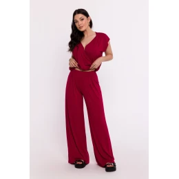 Dámské kalhoty z vysoce kvalitního viskózového úpletu, který se vyznačuje vynikajícím pocitem měkkosti a pohodlí na pokožce. Strečová tkanina zaručuje volnost pohybu, takže kalhoty jsou ideální volbou pro každou příležitost. Tento model je dokonalou kombinací elegance a pohodlí. Kalhoty mají praktický elastický pas, který zajišťuje dokonalé přizpůsobení a zároveň zvýrazňuje postavu. V přední části kalhot jsou modelující záhyby, které jim dodávají jedinečný charakter a jemně zdůrazňují ženské křivky. Díky tomuto detailnímu prvku jsou kalhoty nejen funkční, ale také ideální pro styling k různým příležitostem. Nohavice kalhot byly navrženy s ohledem na pohodlí a směrem dolů se rozšiřují. To je nejen módní akcent, ale také praktické řešení pro volný pohyb. Díky jedinečnému střihu vypadají kalhoty skvěle jak pro každodenní styling, tak pro formálnější události. Je třeba zdůraznit, že kalhoty byly navrženy a vyrobeny v Polsku, což dokazuje jejich vysokou kvalitu zpracování a smysl pro detail. Jsou ideální volbou pro uvědomělou ženu, která ocení polskou kvalitu a jedinečný design. Objevte nový rozměr pohodlí a stylu s dámskými kalhotami z viskózového úpletu, které jsou spojením elegance, funkčnosti a módního patriotismu.