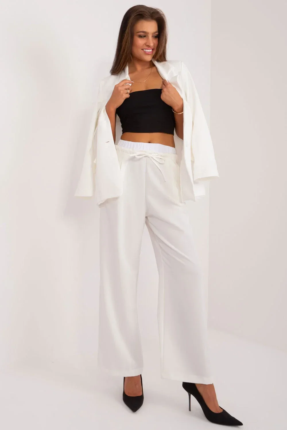 Tyto elegantní palazzo kalhoty jsou kvintesencí stylu a pohodlí a hodí se jak pro každodenní situace, tak pro formálnější příležitosti, od práce až po večerní vycházky. Díky hladkému materiálu vypadají obzvlášť elegantně a hodí se pro různé příležitosti bez ohledu na roční období. Vysoký pas zvýrazňuje pas, dodává mu ženský nádech a zároveň zajišťuje pohodlí. Široké nohavice ve stylu palazzo jim dodávají luxusní vzhled a volnost pohybu, takže jsou ideální volbou pro dlouhé dny v práci nebo večerní večírky. Ozdobné záševky na přední straně kalhot dodávají kalhotám originalitu a jedinečnost a zároveň umocňují jejich elegantní styl. Kromě toho mají kalhoty zasouvací boční kapsy, které jsou praktickým doplňkem celkového designu. Palazzo kalhoty se zavazováním v pase umožňují upravit střih, díky čemuž dokonale padnou každé siluetě. Nechte tyto kalhoty, aby se staly nedílnou součástí vašeho šatníku a dodaly šik a eleganci každému outfitu, ať už se jedná o jakoukoli příležitost.