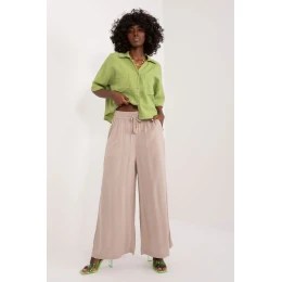 Kalhoty palazzo jsou ideální volbou pro každodenní outfit, kombinující pohodlí s elegancí. Jsou vyrobeny z viskózy, která zajistí měkkost a prodyšnost, a proto se skvěle hodí jak na teplé dny, tak na chladnější večery. Široké nohavice dodávají volný a nonšalantní vzhled, který skvěle zapadá do ležérního stylu. Další výhodou jsou praktické zapichovací kapsy, které zvyšují funkčnost kalhot. Vysoký pas zdůrazňuje pas a opticky prodlužuje siluetu, což činí tyto kalhoty velmi výhodnými pro každou postavu. Šňůrky na stahování umožňují ideální přizpůsobení pasu a absence zapínání zaručuje pohodlí při nošení. Jednoduchý a jednobarevný design činí z těchto kalhot všestranný kus oblečení, který lze snadno kombinovat s různými tílky a doplňky. Jedná se o univerzální návrh pro ženy, které si cení módy a pohodlí ve svém každodenním životě.