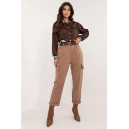 Dámské cargo kalhoty s ležérním charakterem, ideální jak do každodenního nošení, tak do práce. Vyrobené z směsi bavlny, polyamidu a elastanu, poskytují pohodlí a volnost pohybu. Hladký vzor dominuje, dodávající kalhotám univerzální a stylový vzhled. Vysoký pas a sevřené nohavice zdůrazňují siluetu, přidávají celku elegantní charakter. Kalhoty jsou vybaveny praktickým, zapínacím páskem, který umožňuje ideální přizpůsobení pasu. Boční, vsunuté kapsy zdůrazňují jejich funkčnost a cargo styl, činí je skvělou volbou na každou příležitost.