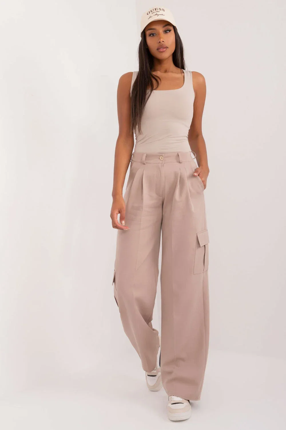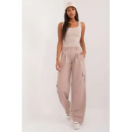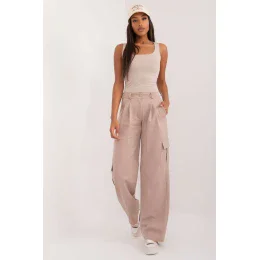 Dámské cargo kalhoty v casual stylu, skvělé na každodenní nošení pro ženy, které si cení pohodlí a funkčnost. Vyrobené z směsi bavlny, polyesteru a elastanu, poskytují pohodlí nošení, odolnost a lehkost materiálu. Model s hladkým vzorem a vysokým pasem, který zdůrazňuje pas, kombinuje praktičnost s moderním designem. Nohavice s rovným střihem vypadají stylově a poskytují volnost pohybu. Kalhoty jsou vybaveny bočními kapsami na zip a charakteristickými kapsami typu cargo, které jim dodávají charakteristický, užitkový vzhled. Dekorativní záhyby zdůrazňují výjimečný design a dodávají celku módní akcent. Zapínání na zip a knoflík zaručuje pohodlí při oblékání. Ideální ve spojení s tričkem, mikinou nebo bundou na každý den.