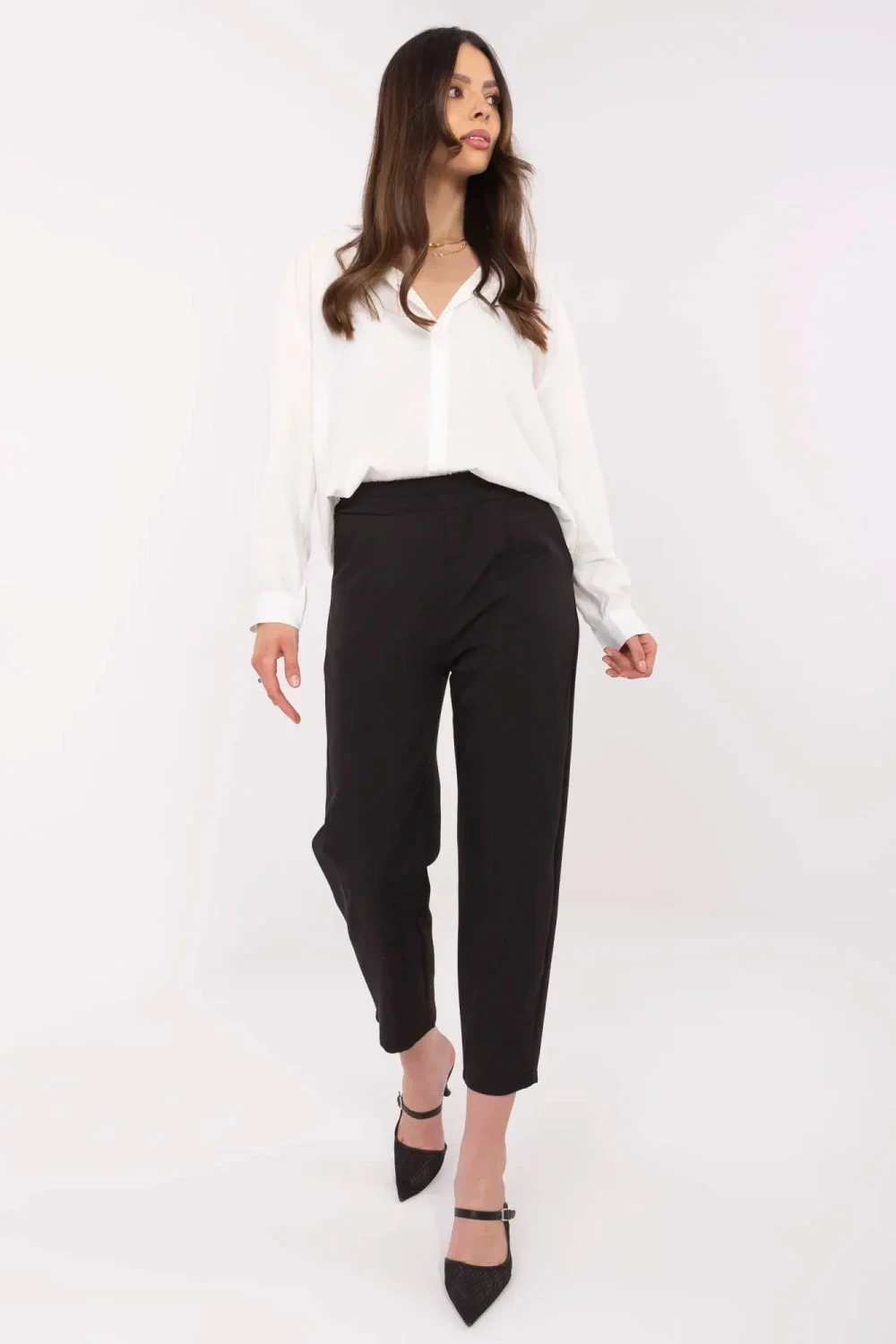 Elegantní cygaretky pro ženy jsou ideální kombinací stylu a pohodlí. Vyrobené z hladkého materiálu s převahou polyesteru a přídavkem elastanu skvěle padnou, poskytují pohodlí po celý den. Zužující se nohavice dodávají kalhotám moderní a elegantní charakter, a vysoký pas s gumou zaručuje ideální přizpůsobení bez stlačování. Boční kapsy přidávají praktičnost a jemný volný vzhled. Tyto elegantní cygaretky se skvěle hodí jak do běžných pracovních stylizací, tak i na formální události.