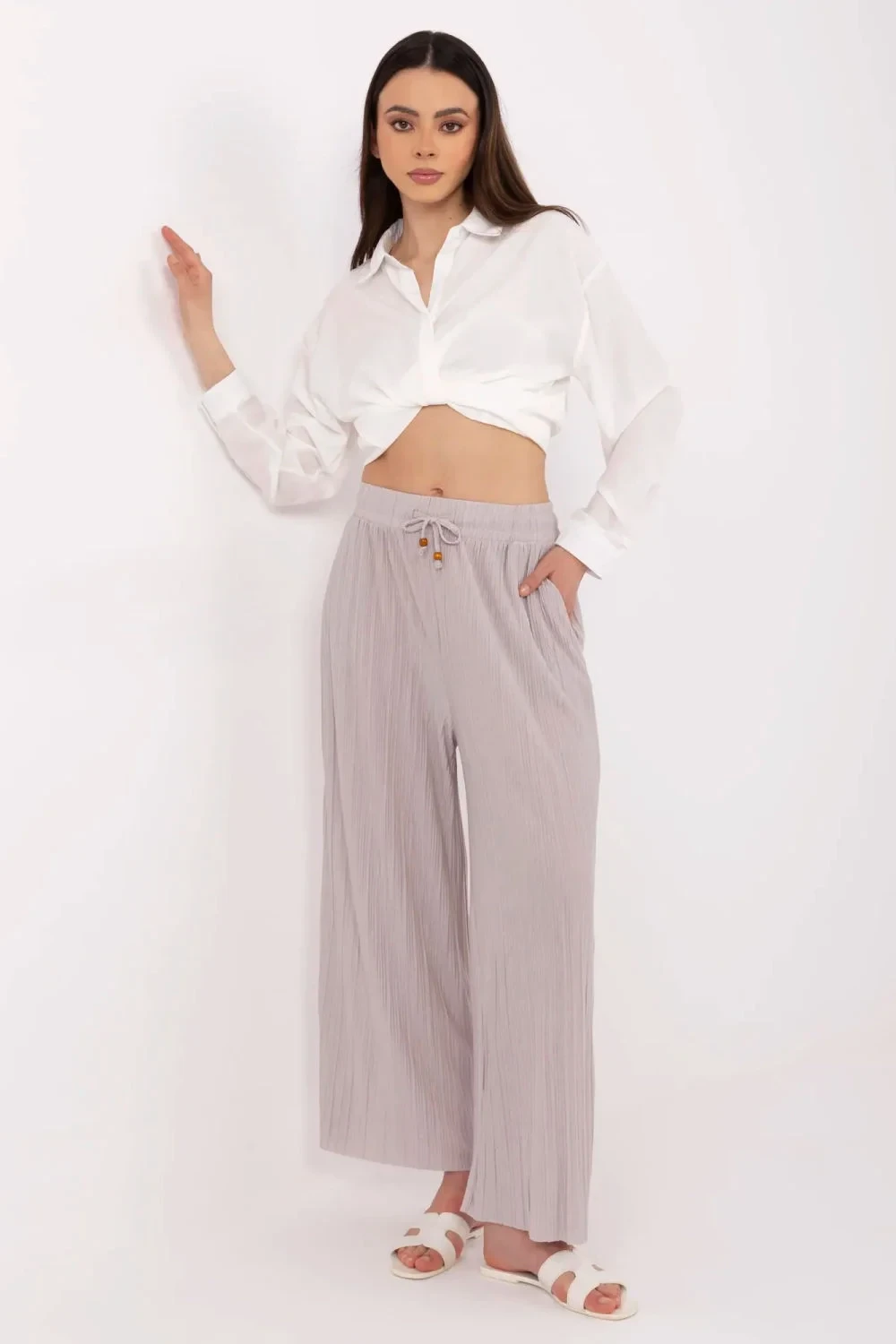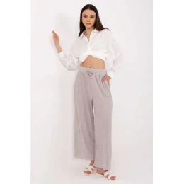 Tyto casualové dámské kalhoty jsou kombinací pohodlí a moderního stylu. Vyrobené z měkké směsi viskózy a polyesteru, skvěle padnou na postavě, poskytují pohodlí po celý den. Hladký materiál a klasický střih zaručují, že kalhoty budou skvěle vypadat v každodenních stylizacích - jak do práce, tak na procházku nebo setkání s přáteli. Vysoký pas a šněrování v pase hezky zdůrazňují pas, zatímco široké nohavice dodávají lehkost a volnost pohybu. Praktické boční kapsy doplňují funkční charakter tohoto modelu.