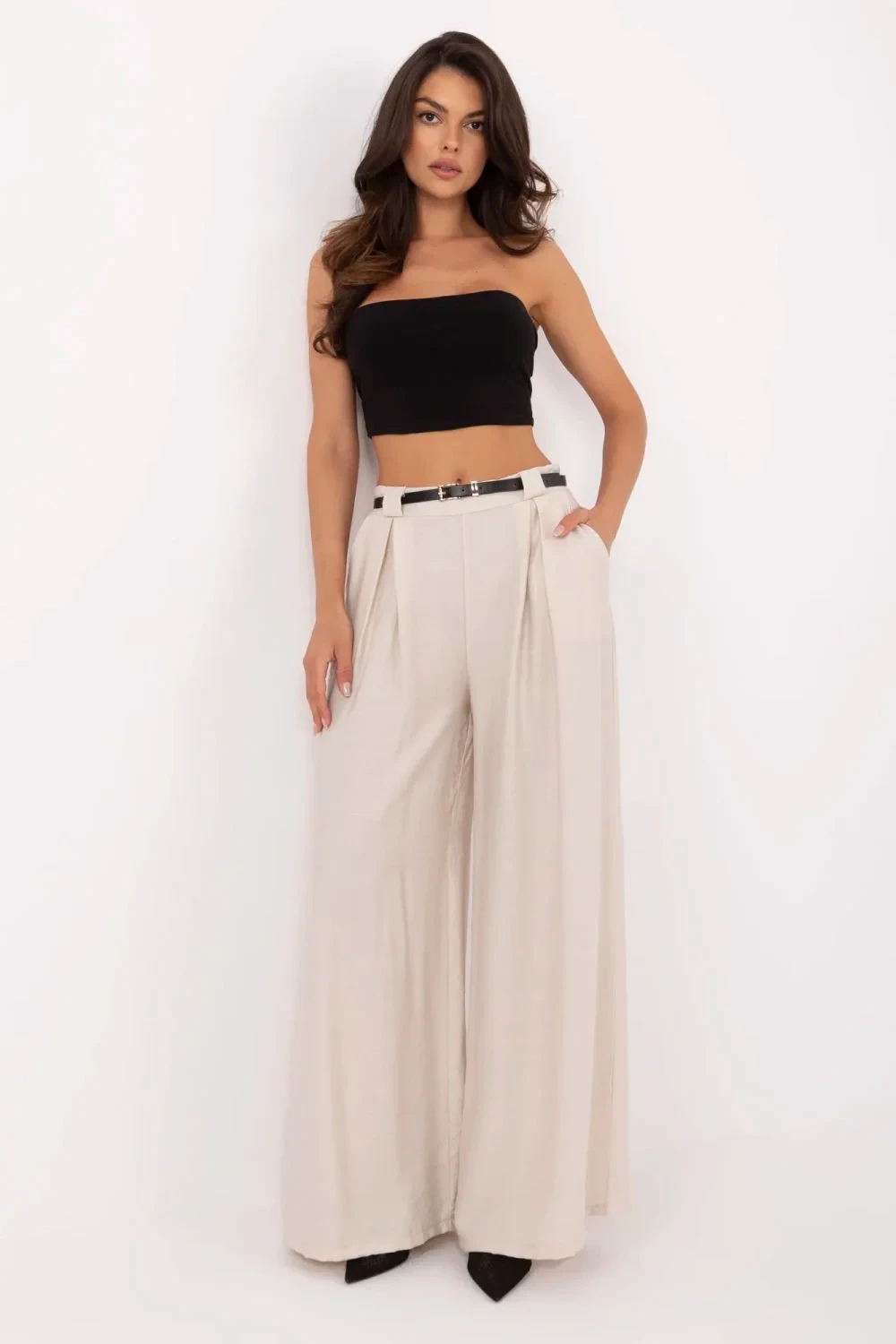 Stylové, materiálové dámské kalhoty typu palazzo jsou ideální volbou na každý den i do práce. Vyrobené z lehké a příjemné směsi viskózy a nylonu, poskytují pohodlí při nošení a volný, elegantní vzhled. Model s hladkou strukturou a širokými nohavicemi vypadá mimořádně lehce a moderně. Vysoký pas s elastickou gumou vpředu se skvěle přizpůsobuje postavě, zdůrazňuje pas a zajišťuje pohodlí po celý den. Kalhoty nemají klasické zapínání, což dále zvyšuje jejich pohodlí při nošení, a součástí je zapínací pásek, který zdůrazňuje pas a dodává celku elegantní dokončení. Boční kapsy s přišitím zvyšují jejich praktičnost.