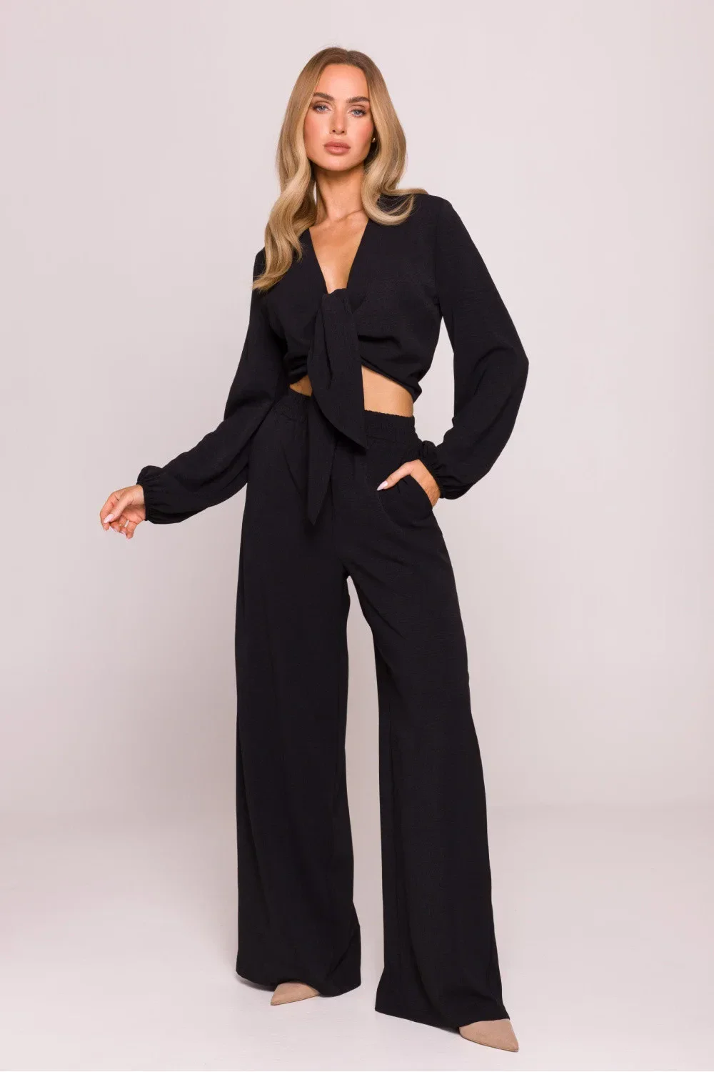 Stylové a pohodlné kalhoty vyrobené z lehké látky s výraznou strukturou krepu s matným povrchem. Model s volným střihem a širokými, dlouhými nohavicemi poskytuje volnost pohybu a moderní vzhled, ideální jak na každý den, tak i na elegantnější outfit. Vysoký, elastický pas zajišťuje skvělé přizpůsobení postavy a snadné nasazení bez zipu, bez knoflíků. Chybějící kapsy zdůrazňují jednoduchost a lehkost tvaru. Navrženo a ušito v Polsku s ohledem na pohodlí a nadčasový styl.