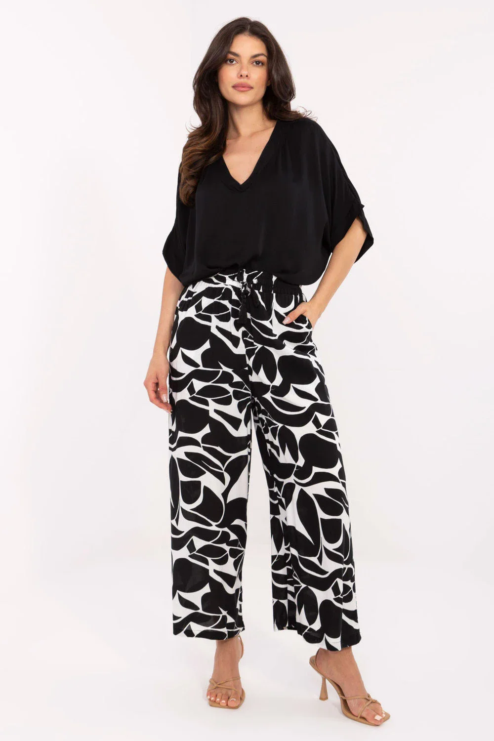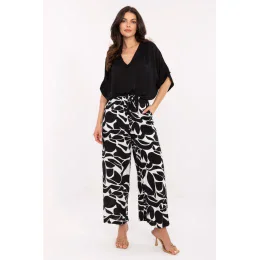 Lehké a pohodlné dámské kalhoty s casualovým charakterem jsou ideální volbou pro každodenní outfit. Vyrobené z prodyšné viskózy přátelské k pokožce, která patří do kategorie ekologického oblečení, spojují pohodlí nošení s péčí o životní prostředí. Vysoký pas a vázání v pase zajistí skvělé přizpůsobení a zdůrazní pas, zatímco široké nohavice dodají postavě lehkost. Dekorativní potisk dodává charakter a boční kapsy zvyšují funkčnost. Jedná se o skvělý návrh pro ženy, které ocení styl, pohodlí a uvědomělé výběry.