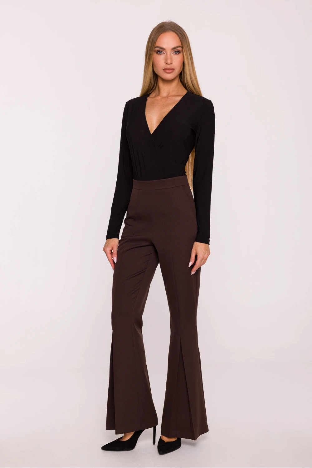 Elegantní dámské kalhoty šité z hladkého kostkového materiálu s matným povrchem jsou návrh, který spojuje klasiku s moderním stylem. Materiál je lehký, dobře padne na postavě a zdůrazňuje přiléhavý střih. Model s vysokým pasem krásně zdůrazňuje pas a opticky prodlužuje postavu. Nohavice jsou dlouhé, rozšířené ke dnu, a efektní záhyby na přední straně dodávají celku eleganci a lehkost pohybu. Zapínání na skrytý zip vzadu zajišťuje estetické a pohodlné nošení, a boční kapsy s vložkami přidávají funkcionalitu, zachovávají minimalistický charakter kalhot. Střih přiléhavý v bocích, rozšiřující se ke dnu, vytváří harmonickou linii postavy, která vypadá stylově a žensky v každé situaci. Kalhoty sahají až na zem, což umožňuje kombinovat je jak s podpatky, tak s elegantními plochými botami. Navrženo a ušito v Polsku pro ženy, které oceňují klasickou eleganci, perfektní provedení a pohodlnost nošení.