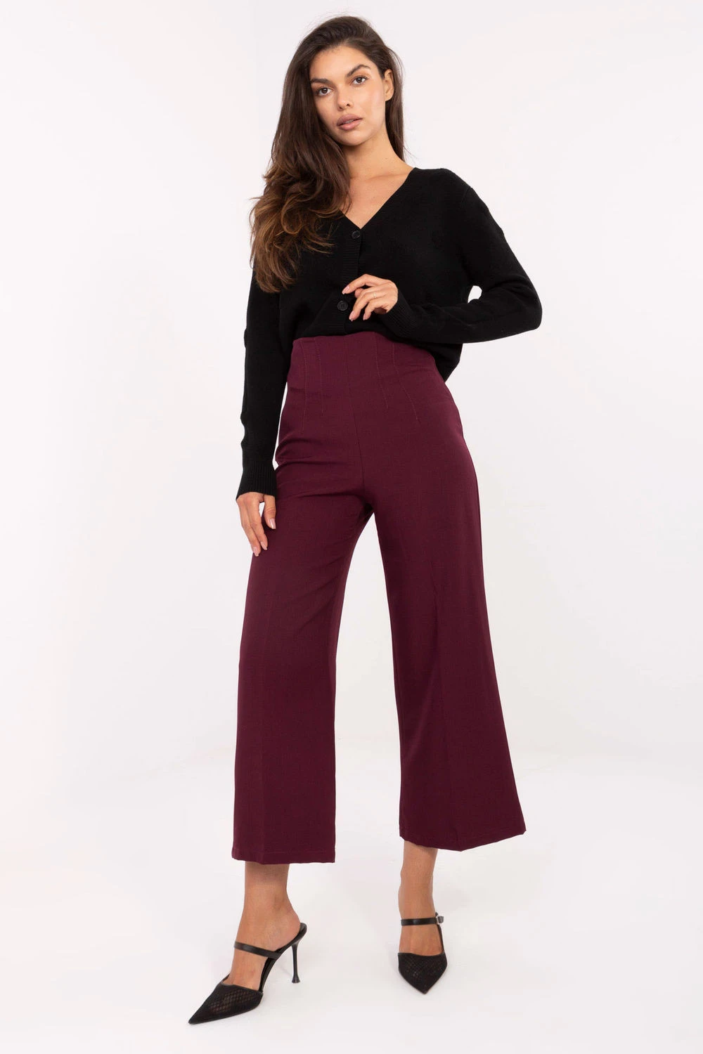Elegantní kalhoty typu culottes jsou návrh, který spojuje styl a pohodlí. Vyrobené z vysoce kvalitního polyesteru s přídavkem elastanu, jsou hladké, lehké a pohodlné na nošení. Model s vysokým pasem krásně zdůrazňuje pas, zatímco široké nohavice dodávají postavě lehkost a moderní charakter. Kalhoty se zapínají na skrytý zip umístěný na levé straně, což zaručuje estetické provedení. Chybějící kapsy zdůrazňují elegantní, minimalistický styl. Ideální jak na každý den, do práce, tak i na společenské příležitosti jsou nadčasové culottes, které se hodí do mnoha stylizací.