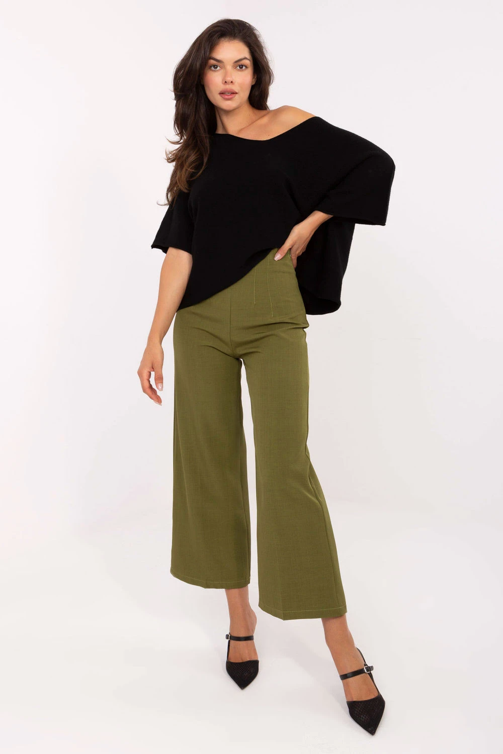 Elegantní kalhoty typu kuloty jsou návrhem, který spojuje styl a pohodlí. Vyrobené z vysoce kvalitního polyesteru s přídavkem elastanu, jsou hladké, lehké a pohodlné na nošení. Model s vysokým pasem krásně zdůrazňuje pas, zatímco široké nohavice dodávají postavě lehkost a moderní charakter. Kalhoty se zapínají na skrytý zip umístěný na levé straně, což zaručuje estetické provedení. Chybějící kapsy zdůrazňují elegantní, minimalistický styl. Ideální jak do práce, tak na společenské události, nadčasové kuloty, které se hodí do mnoha stylizací.