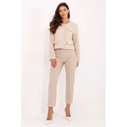 Elegantní dámské cygaretky jsou klasikou, která se hodí do mnoha stylizací, jak do každodenního života, práce, tak i na večírky. Vyrobené z vysoce kvalitního polyesteru s přídavkem elastanu zajistí pohodlí při nošení a jemně se přizpůsobí siluetě. Model s vysokým pasem krásně zdůrazní pas, zúžené nohavice prodlouží nohy a dodají celému outfitu elegantní charakter. Kalhoty se zapínají na skrytý zip umístěný na levé straně, což zaručuje estetické a elegantní provedení. Minimalistický, hladký střih z nich činí univerzální základ pro mnoho elegantních a moderních outfitů.