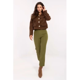 Elegantní dámské cigaretové kalhoty jsou klasikou, která se hodí do mnoha stylizací, jak do každodenního života, do práce, tak i na večírkové události. Vyrobené z vysoce kvalitního polyesteru s přídavkem elastanu zajistí pohodlí nošení a jemně se přizpůsobí postavě. Model s vysokým pasem krásně zdůrazní pas, zúžené nohavice zase zeštíhlí nohy, dodávají celku elegantní charakter. Kalhoty se zapínají na skrytý zip umístěný na levé straně, což zaručuje estetické a elegantní provedení. Minimalistický, hladký střih z nich činí univerzální základ pro mnoho elegantních a moderních outfitů.