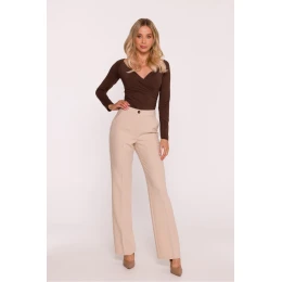 Klasické dámské kalhoty vyrobené z hladké látky s měkkým povrchem. Střih oblečení, přizpůsobený v pasu a bocích, s přímými, dlouhými nohavicemi s ohnutým lemem, které zúží siluetu a přidají eleganci. Model má střední výšku pasu a praktické boční kapsy. Zapínání vpředu na knoflík a skrytý zip zaručuje pohodlí a estetické provedení. Bez podšívek jsou kalhoty lehké a pohodlné na nošení. Nadčasový střih se hodí jak do obchodních stylizací, tak do formálních outfitů. Navrženo a ušito v Polsku.