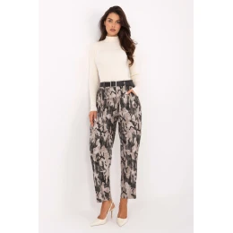 Dámské látkové kalhoty v casual stylu, ideální na každý den. Vyrobena z směsi viskózy, polyesteru a elastanu, kombinuje pohodlí s pružností a odolností. Model s vysokým pasem, se zužujícími se nohavicemi a elastickým páskem zajistí pohodlné nošení, a zapínací pásek zdůrazní pas. Boční kapsy a módní vzor moro po celém materiálu dodávají kalhotám moderní, výrazný charakter.