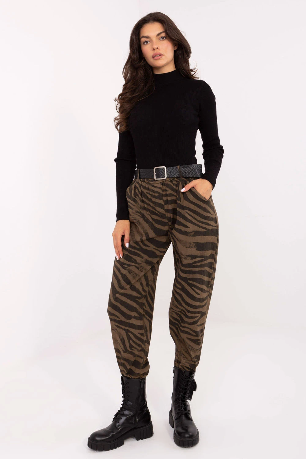 Dámské látkové kalhoty ve stylu casual, ideální na každý den. Vyrobené z směsi viskózy, polyesteru a elastanu, kombinují pohodlí s pružností a odolností. Model s vysokým pasem, uzavřenými nohavicemi a elastickým páskem poskytuje pohodlí nošení, a zapínací pásek zdůrazňuje pas. Boční kapsy a moderní zebra vzor po celém materiálu dodávají kalhotám moderní a výrazný charakter.