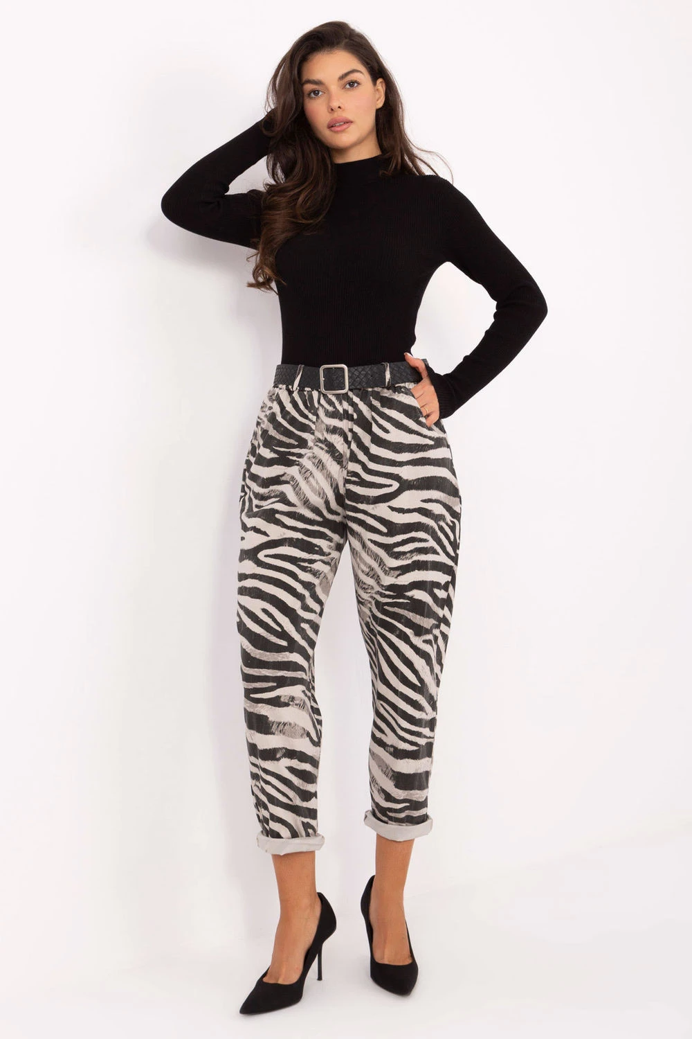 Dámské látkové kalhoty v casual stylu, ideální na každý den. Vyrobené z kombinace viskózy, polyesteru a elastanu, spojují pohodlí s elasticitou a odolností. Model s vysokým pasem, se zužujícími se nohavicemi a gumou v pasu zajistí pohodlí nošení, a zapínací pásek zdůrazní pas. Boční kapsy a módní zebra vzor po celém materiálu dodávají kalhotám moderní a výrazný charakter.