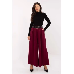 Elegantní dámské kalhoty typu palazzo, skvělé na každý den i do práce. Vyrobené z směsi viskózy a polyesteru, vynikají hladkou strukturou a pohodlným nošením. Vysoký pas s vsazenou gumou a zapínacím páskem zdůrazňuje pas, a ozdobné záložky přidávají celkové eleganci. Široké nohavice dodávají lehkost postavě, a praktické boční kapsy zajišťují funkčnost. Toto je stylový návrh, který spojuje eleganci s pohodlím.