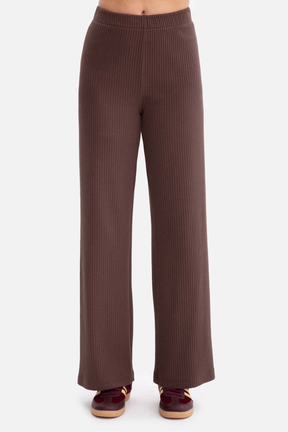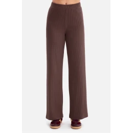 Kalhoty dámské vyrobené z pruhované pleteniny o gramáži 250 g, která je měkká, elastická a příjemná na nošení. Model bez kapes a podšívky s praktickým elastickým pásem zajistí pohodlí a přizpůsobení se postavě. Volný střih, pletené kalhoty jsou přizpůsobeny v pasu a bocích a dále se volně skládají, zaručujíc pohodlí a lehkost. Dlouhé, přímé nohavice se mírně rozšiřují ke dnu, což zjemňuje postavu a dodává celku eleganci. Střední výška sedu zajišťuje, že kalhoty dobře sedí a zdůrazňují pas, zatímco celková délka až na zem dodává moderní, prodlužující efekt nohám. Navrženy a ušity v Polsku z pleteniny vyrobené v Lodži, tato kombinace pohodlí, kvality a nadčasového stylu.