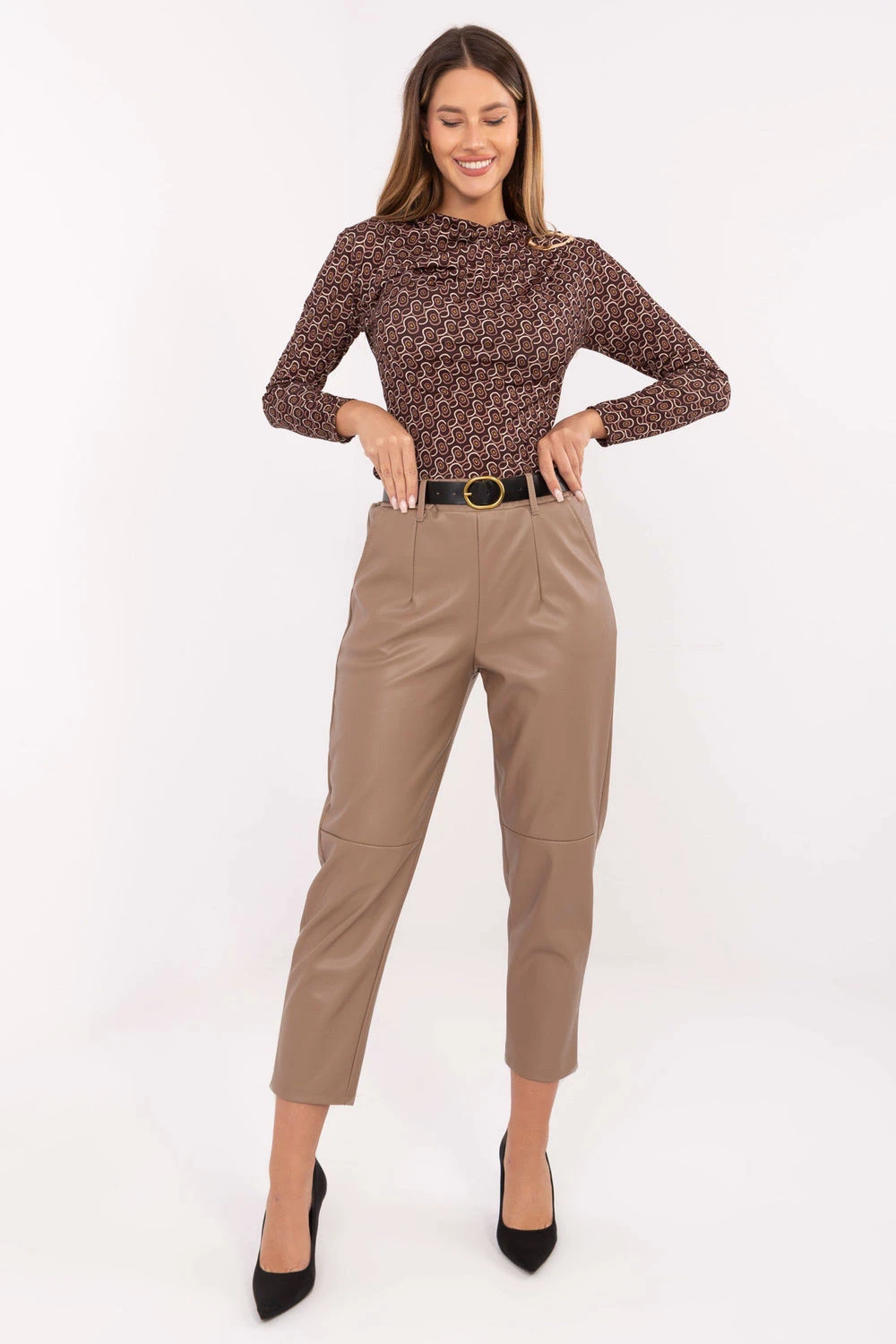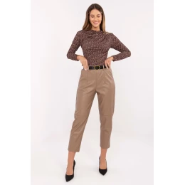 Stylové a pohodlné dámské kalhoty z ekokože jsou ideální volbou pro ženy, které ocení kombinaci elegance a pohodlí. Model bez zapínání s gumou vzadu v pase skvěle padne a usnadňuje oblékání. Vysoký pas decentně zdůrazňuje pas, zúžené nohavice dodávají celku moderní, ženský charakter. Kalhoty jsou vyrobeny z měkké ekokože (kombinace polyester + polyuretan), co zaručuje trvanlivost, pohodlí a efektní vzhled. Boční vložené kapsy přidávají funkčnost, a zapínací pásek umožňuje individuální nastavení v pase. Díky podšívkou jsou kalhoty vhodné i na chladnější dny. Jejich hladký vzor a ležérní styl je činí skvělou volbou jak do práce, tak na každý den.