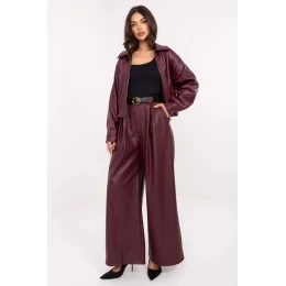 Elegantní a pohodlné kalhoty typu palazzo vyrobené z vysoce kvalitní ekokože (směs polyesteru a polyuretanu). Model s širokými nohavicemi a vysokým pasem krásně zdůrazňuje pas, zároveň poskytuje volnost pohybu. V pasu je vsazena elastická guma, díky čemuž kalhoty perfektně sedí. Navíc mají zapínací pásek, který podtrhuje postavu a dodává celku elegantní akcent. Model má boční kapsy a hladký materiál, což mu dodává moderní, minimalistický charakter. Je to ideální volba pro každodenní nošení, stejně jako do práce, zaručující pohodlí a stylový vzhled po celý den.