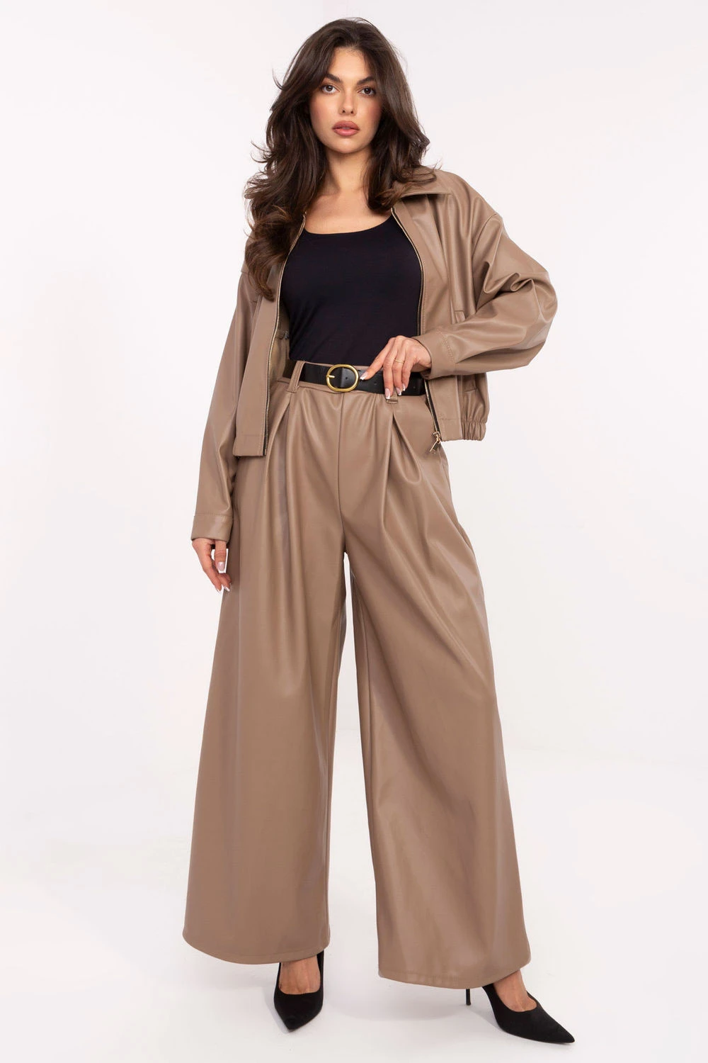 Elegantní a pohodlné kalhoty typu palazzo vyrobené z vysoce kvalitní ekokože (směs polyesteru a polyuretanu). Model s širokými nohavicemi a vysokým pasem krásně zdůrazňuje pas, zároveň poskytuje volnost pohybu. V pasu je vsazena elastická guma, díky čemuž kalhoty perfektně sedí na postavě. Navíc mají zapínací pásek, který pomáhá zdůraznit postavu a dodat celku elegantní akcent. Model má boční kapsy a hladký povrch materiálu, co mu dodává moderní a minimalistický charakter. Je to ideální volba pro ležérní styl, hodí se jak do každodenního života, tak do práce, zajistí pohodlí a stylový vzhled po celý den.