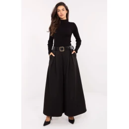Elegantní dámské kalhoty typu palazzo, skvělé na každý den i do práce. Vyrobena z směsi viskózy a polyesteru, vynikají hladkou strukturou a pohodlným nošením. Vysoký pas s gumou a zapínacím páskem zdůrazňuje pas, a ozdobné záložky dodávají celku eleganci. Široké nohavice dodávají lehkost postavě a praktické boční kapsy s vložením zajišťují funkcionalitu. Stylový návrh, který spojuje eleganci s pohodlím.