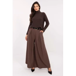 Elegantní a pohodlné dámské kalhoty typu palazzo vyrobené z vysoce kvalitní směsi viskózy a polyesteru, které spojují eleganci s pohodlím nošení každý den i do práce. Hladký materiál dodává kalhotám klasický, rafinovaný charakter a dlouhé, široké nohavice opticky prodlužují postavu, vytvářejí lehký a ženský vzhled. Model má vysoký pas s všitým elastickým pásem pro dokonalé přizpůsobení a záhyby na přední straně, které jemně zdůrazňují pas. Další výhodou je zapínací pásek, který umožňuje přizpůsobit kalhoty postavě a přidat stylizaci rafinovaný akcent. Jedná se o univerzální návrh, který se skvěle hodí jak do každodenních, volnočasových outfitů, tak do výrazných, elegantních stylizací do práce nebo na speciální události.