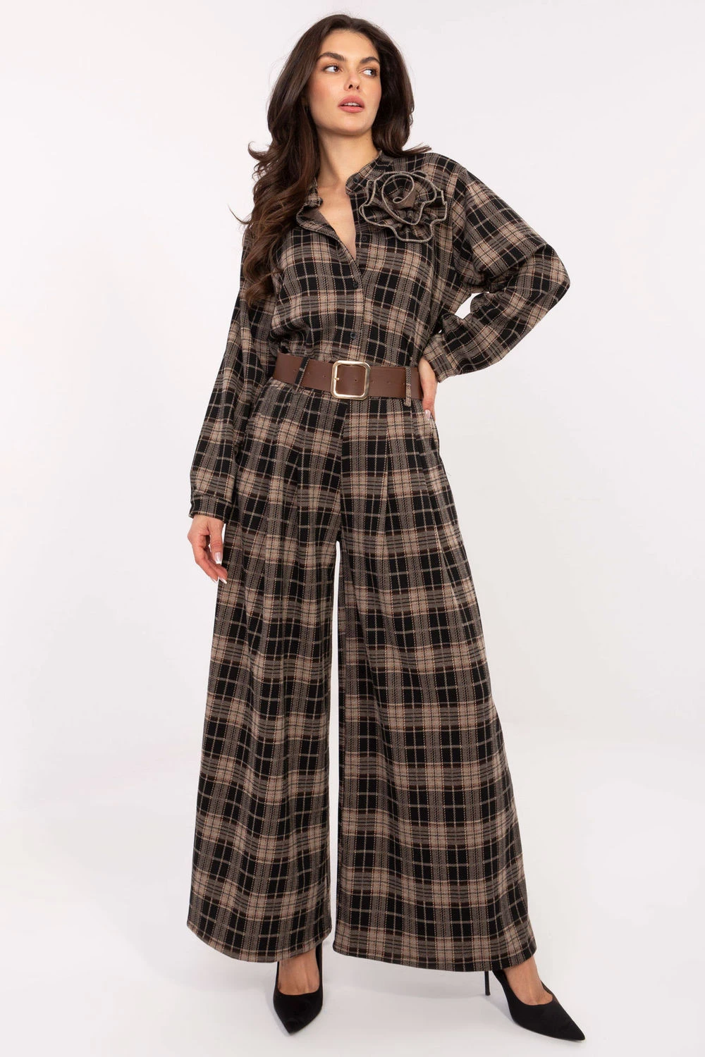 Moderní a pohodlné dámské flanelové kalhoty typu palazzo s casual charakterem, ideální pro každodenní stylizace. Vyrobené z vysoce kvalitní směsi polyesteru, viskózy a elastanu, poskytují pohodlí, lehkost a jemnou pružnost, díky čemuž se skvěle přizpůsobují postavě. Model má vysoký pas a široké nohavice typu palazzo, které opticky prodlužují nohy a dodávají postavě lehkost. Boční kapsy na zip a zapínací pás dodávají praktičnost a umožňují zdůraznit pas. Kalhoty mají kostkovaný vzor, který přináší klasický, nadčasový akcent, a absence zapínání zajišťuje, že jsou mimořádně pohodlné a snadné na použití. Jedná se o univerzální model, který se skvěle hodí jak do každodenních, casual stylizací, tak do elegantnějších outfitů do práce.