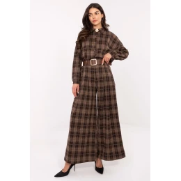 Moderní a pohodlné dámské flanelové kalhoty typu palazzo s casual charakterem, ideální pro každodenní styling. Vyrobené z vysoce kvalitní směsi polyesteru, viskózy a elastanu, poskytují pohodlí, lehkost a jemnou pružnost, díky čemuž se skvěle přizpůsobují postavě. Model má vysoký pas a široké nohavice typu palazzo, které opticky prodlužují nohy a dodávají postavě lehkost. Boční kapsy a zapínací pásek přidávají praktičnost a umožňují zdůraznit pas. Kalhoty mají kostkovaný vzor, který přináší klasický, nadčasový akcent, a absence zapínání zajišťuje, že jsou mimořádně pohodlné a snadno použitelné. Jedná se o univerzální model, který se skvěle hodí jak do každodenních, casual stylizací, tak do více elegantních setů do práce.
